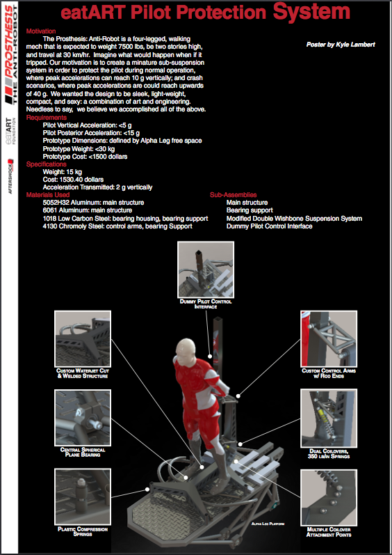 I am fortunate to have had the opportunity to work on this amazing project, the brainchild of chief engineer and creative director Jonathan Tippett. As part of a UBC's final year design project I was part of a team that created a suspension system for the Alpha Leg (a fully functional two-thirds scale prototype of the legs to be used in the final machine). This system mounts atop the Alpha Leg to allow the pilot to ride the leg as he/she jumps it back and forth. You can read a summary report of our project here.